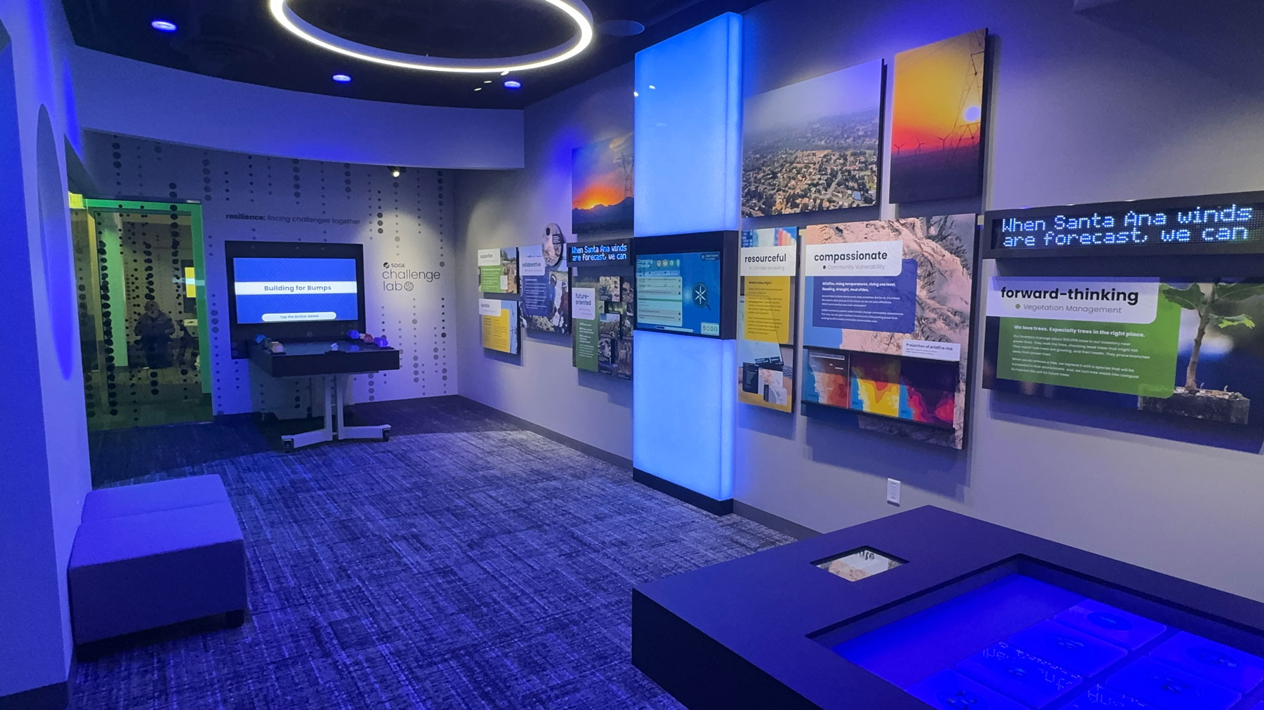 2. Fire Science & Innovation Lab (Innovation Lab) & Experience Center: Dedicated to pioneering advancements in wildfire forecasting and the broader battle against climate change, this dual-purpose facility not only exhibits SDG&E’s trailblazing technologies but also serves as a collaborative space. It’s home to a team of meteorologists at the forefront of wildfire defense and invites community engagement through an interactive experience center complemented by dynamic visual displays.
